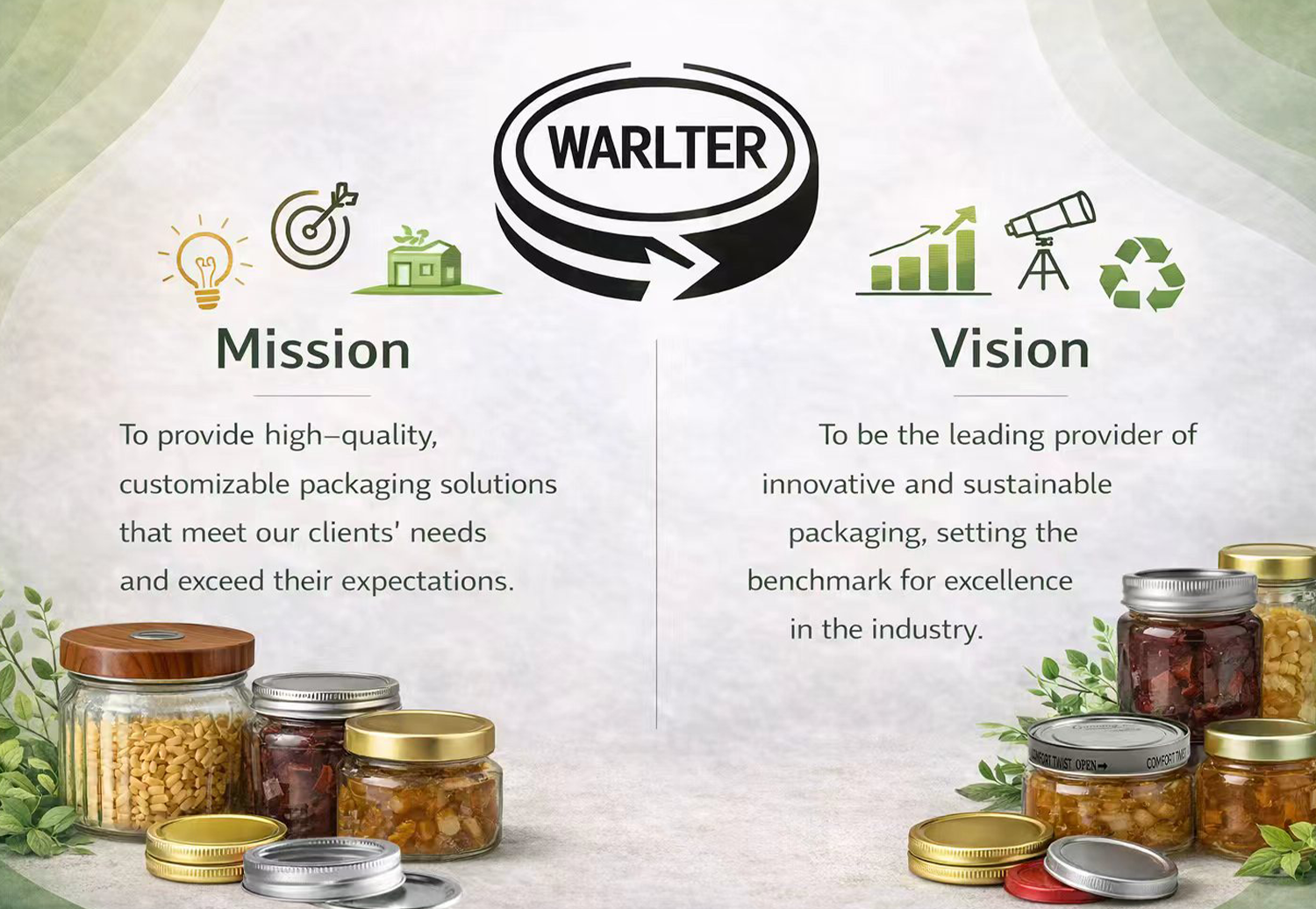 تأسست عام 2014، Xuzhou Warlter Packaging Products Co., Ltd. هي شركة متخصصة في تصنيع حلول التغليف الزجاجي وأنظمة الأغطية سهلة الفتح. يقع مقرنا في شوتشو، الصين، ونحن نقدم الجرار الزجاجية المخصصة للطعام، والزجاجات، والأغطية المعدنية، وبرطمانات عش الطيور، والجرار الماسونية، والأباريق، وأكواب الألومنيوم للأسواق العالمية.